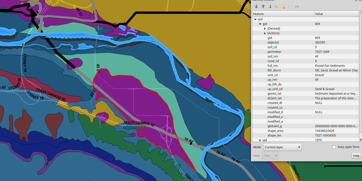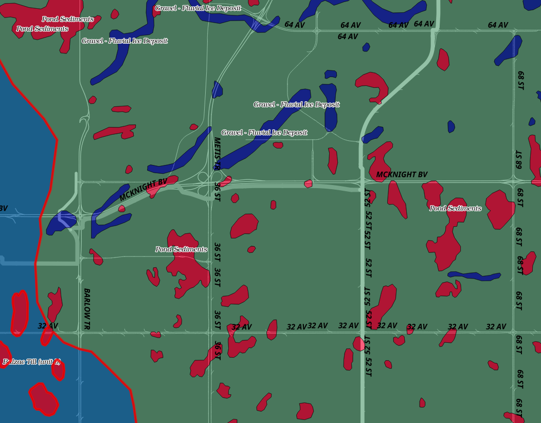 Note the deep blue colour for the soil polygons that are "Fluvial Gravel", that is, river gravels way up on a hill, because Calgary was put through multiple mix-master passes by glaciers that put every soil everywhere.