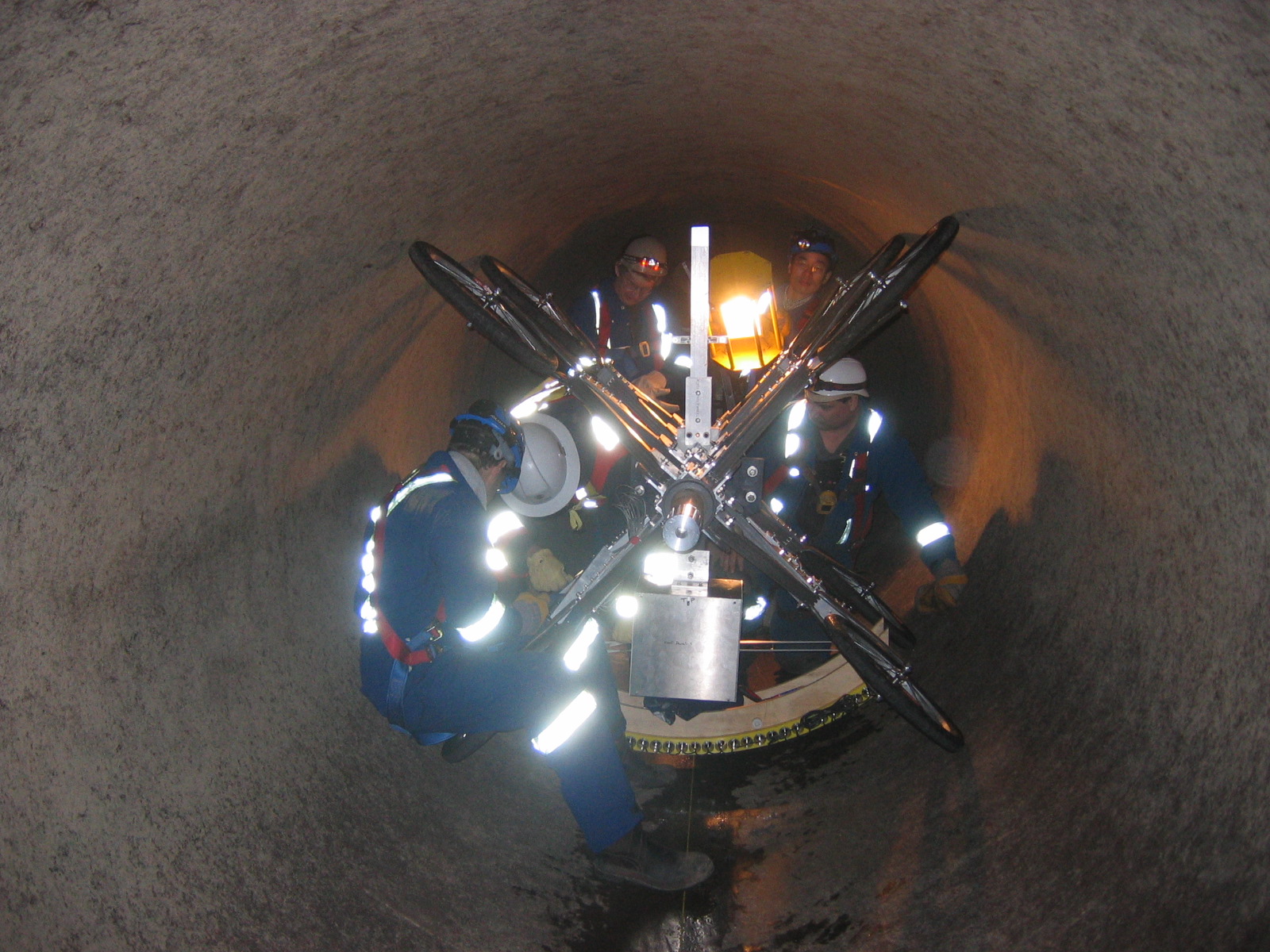 This 2009 slide shows the state of the art, for commercial, reliable work, at the time. The inspections not only required the main to be de-watered, meaning thousands of tonnes of water to be dechlorinated and wasted... they required four guys pushing it along, with eight bike wheels cradling it.