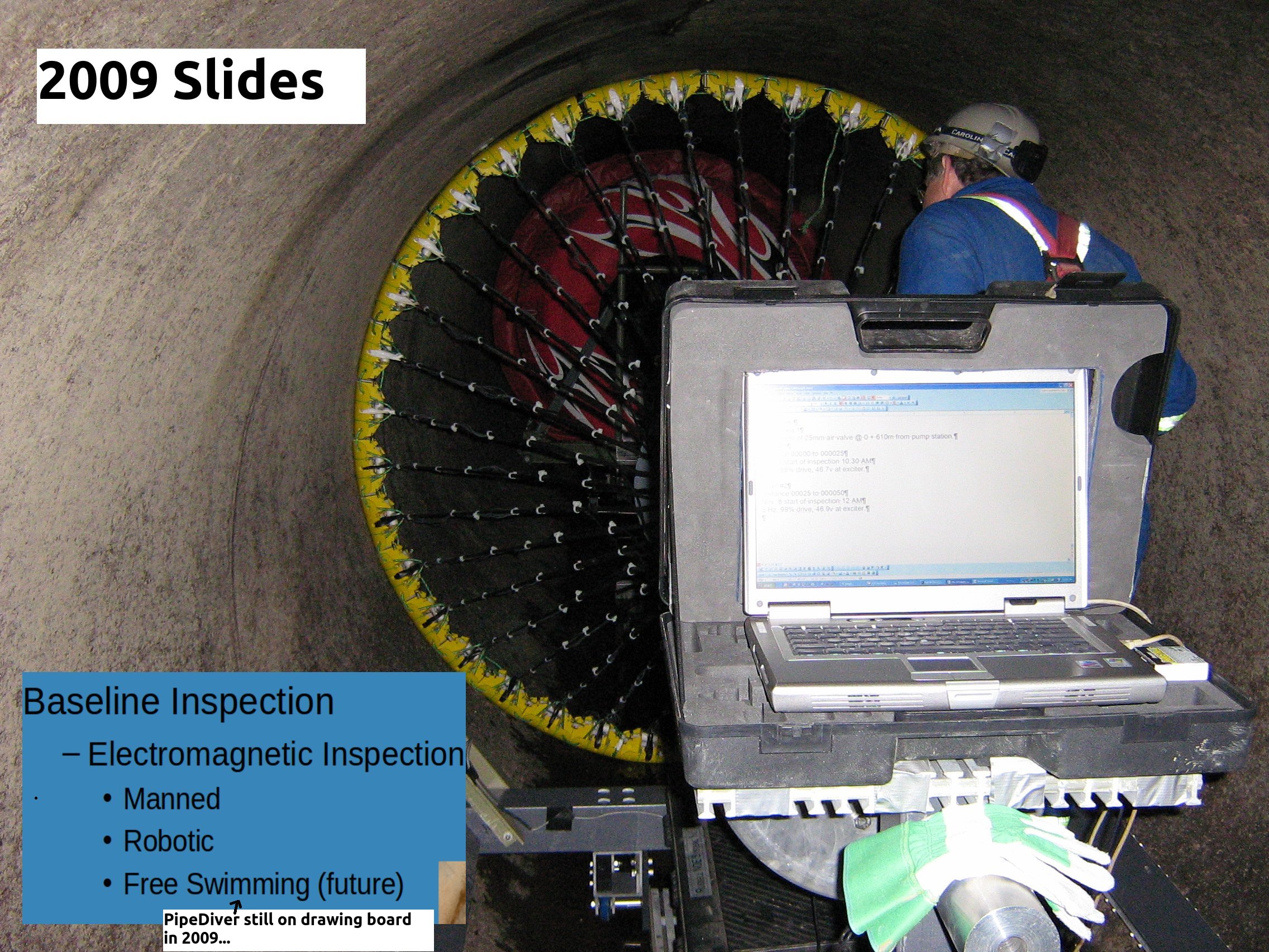 This 2009 presentation is our first to mention the eventual fully-submerged submarine inspection tool, the DipeDiver, then starting development.