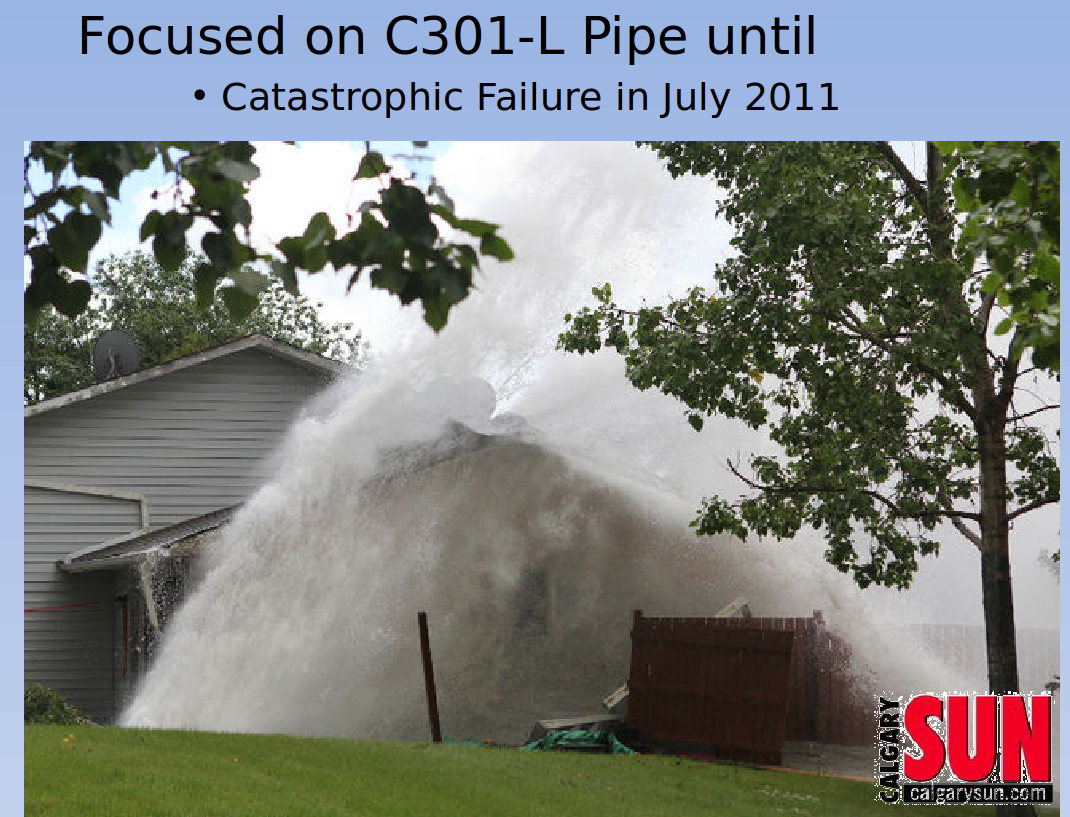 Steel mains are entirely different in failure: just a leak at first, smaller than a dime, and audible. Parenthetically, I predict a bright future for steel feedermain sales in Calgary in future. Maybe for generations.