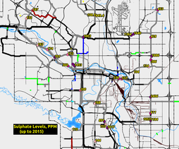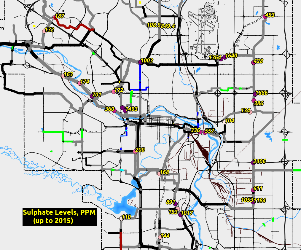 The were tests run in 2014, and they weren't alarming, within range of expectations anywhere in Calgary that wasn't pond sediments. Look around the rest of the map, and you see sulphate numbers up around 1000 and 2000, over in the freckled east, and even one 1493, just a half-kilometre north on Crowchild.