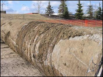 The general green all around the gravel and pond sediment blobs is called "Crossfield Till", about equal parts of sand and silt and gravel, and not very corrosive; we didn't have to inspect everywhere - not immediately.